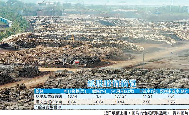 紙業股去年累積一定升幅,然而行業市盈率(PE)偏低,估值最高的玖紙市盈率約11倍左右,理文市盈率僅8倍左右,在市場需求強勁下包裝紙價格會有上升空間,相信紙價有加價無減價,紙業股有望追落後。