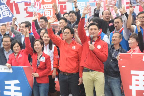 鄭泳舜(前右一)、鄧家彪(前右二)及陳家珮(前右三)盡最大努力爭取選民支持,圖為3人攜手舉行造勢會。