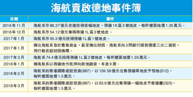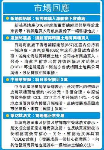 【香港商報網訊】記者吳天淇報道:繼恒地(012)早前買入海航集團投得的兩幅啟德地皮後,會德豐(020)昨日宣布,以63.592億元買入海航集團所持的啟德6564號地皮,平均樓面呎價約14950元,溢價15%。市場分析師認為作價合理,符合市場水平。