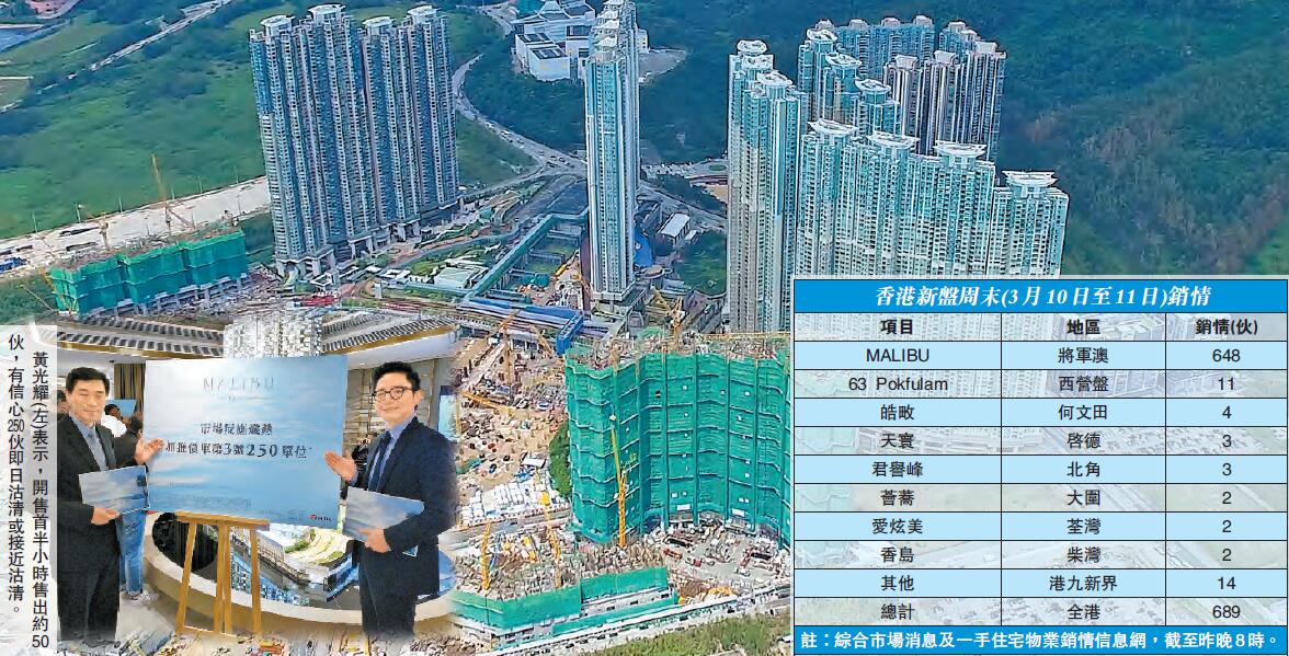 陳永傑預料3月一手成交量可達2300宗,除「MALIBU」外,其他一手發展商貨尾成交亦相當不俗。反映於資金市下,市民投資物業收租抵銷通脹,「MALIBU」長線投資者比例達五成。