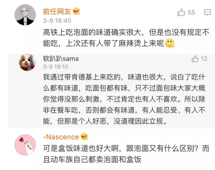 此外,更多的人产生了疑惑:高铁、动车上到底能吃泡面吗?