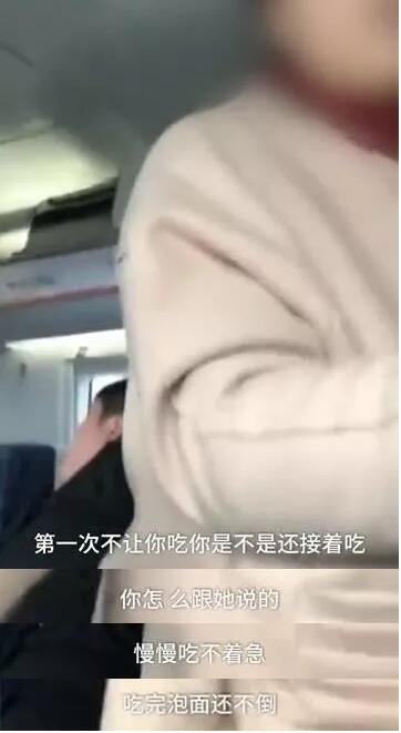 视频中,一名女子高声斥责一吃泡面的乘客。她说,自己已经跟这名乘客说过不要吃,但该男子还是坚持和同行的女子吃了泡面,还告诉同行女子慢慢吃。