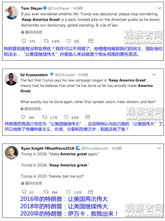 据悉,特朗普宣布新竞选口号后,国外社交媒体上也是追捧和冷嘲热讽并存。特朗普的众多支持者认为,他说的那番话和这个新口号都棒呆了!