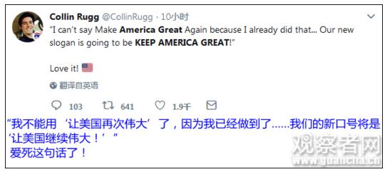 美国国家广播公司(NBC)3月10日报道称,此次新口号“似乎是在宣布他已经完成了(让美国再次伟大的)任务’。”