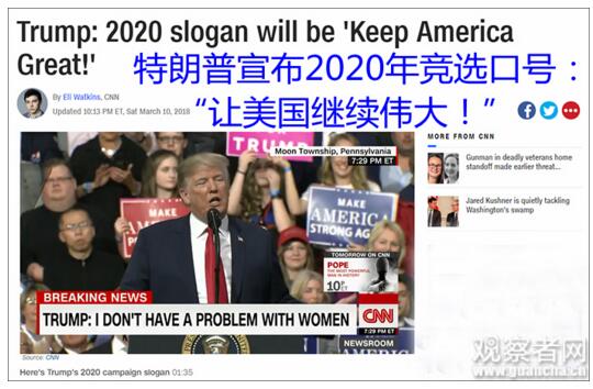 事实上,去年1月,特朗普在已当选却尚未宣誓就职前,就已经向媒体“剧透”了2020年的连任竞选口号——“让美国再次伟大”的下一阶段,“让美国继续伟大”。