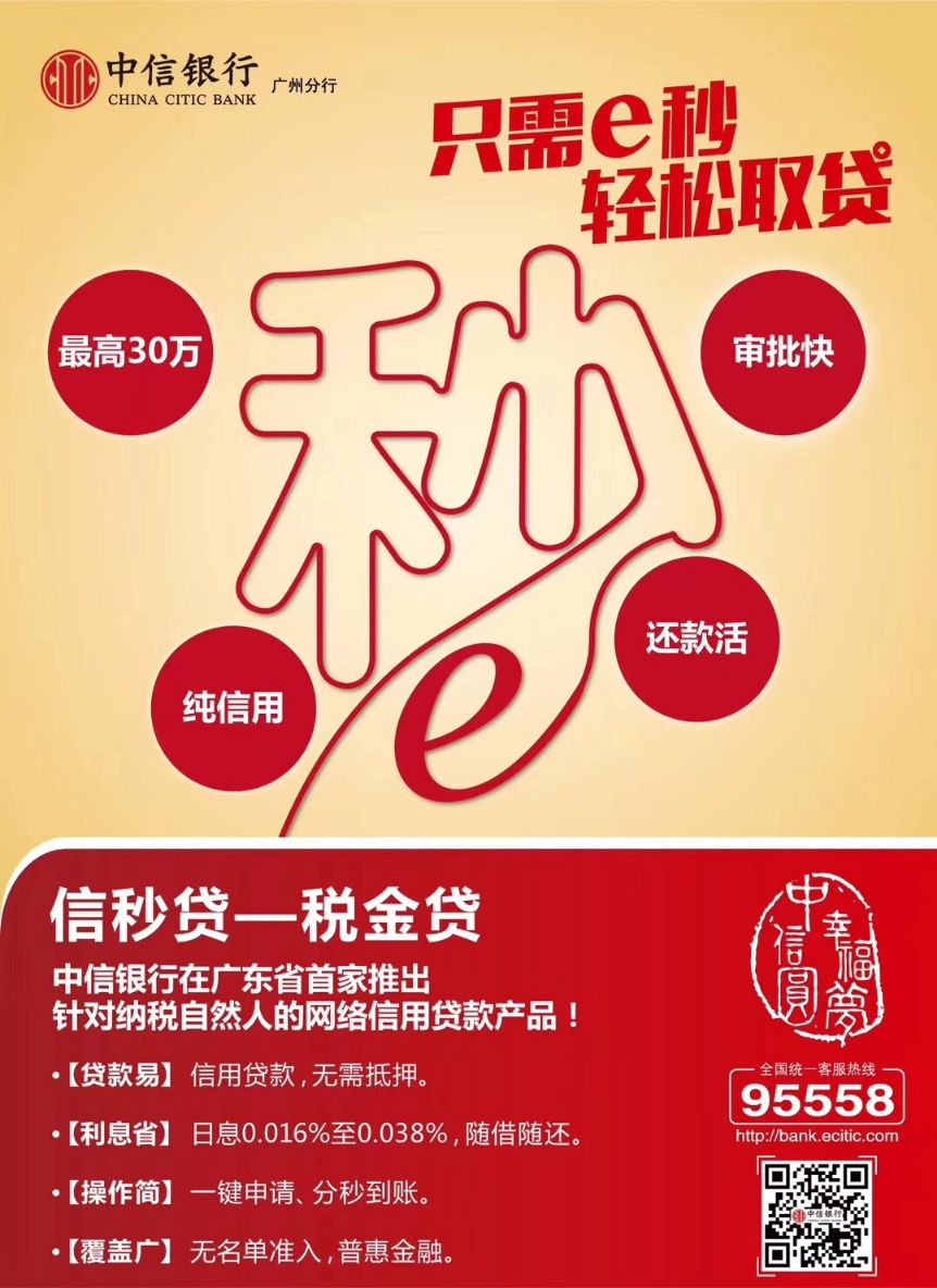 据悉,在项目筹备期间,广州市地税局、中信银行广州分行密切沟通协作,确保了“信秒贷—税金贷”的广州市诚信纳税用户人群的选取。中信银行广州分行工作人员提醒,客户需开立中信银行借记卡及UKEY版个人网银,以实现“信秒贷—税金贷”的资金到账。