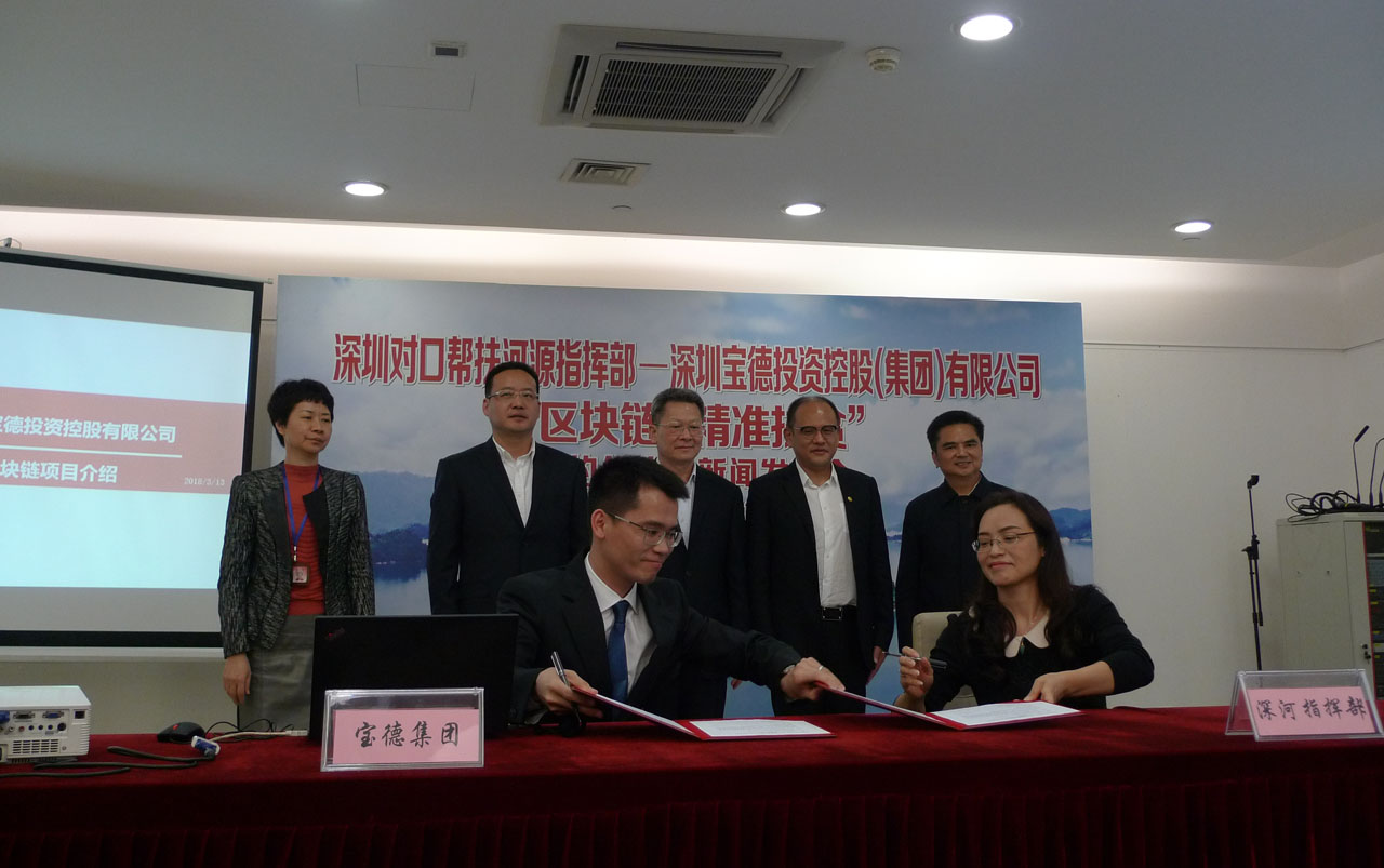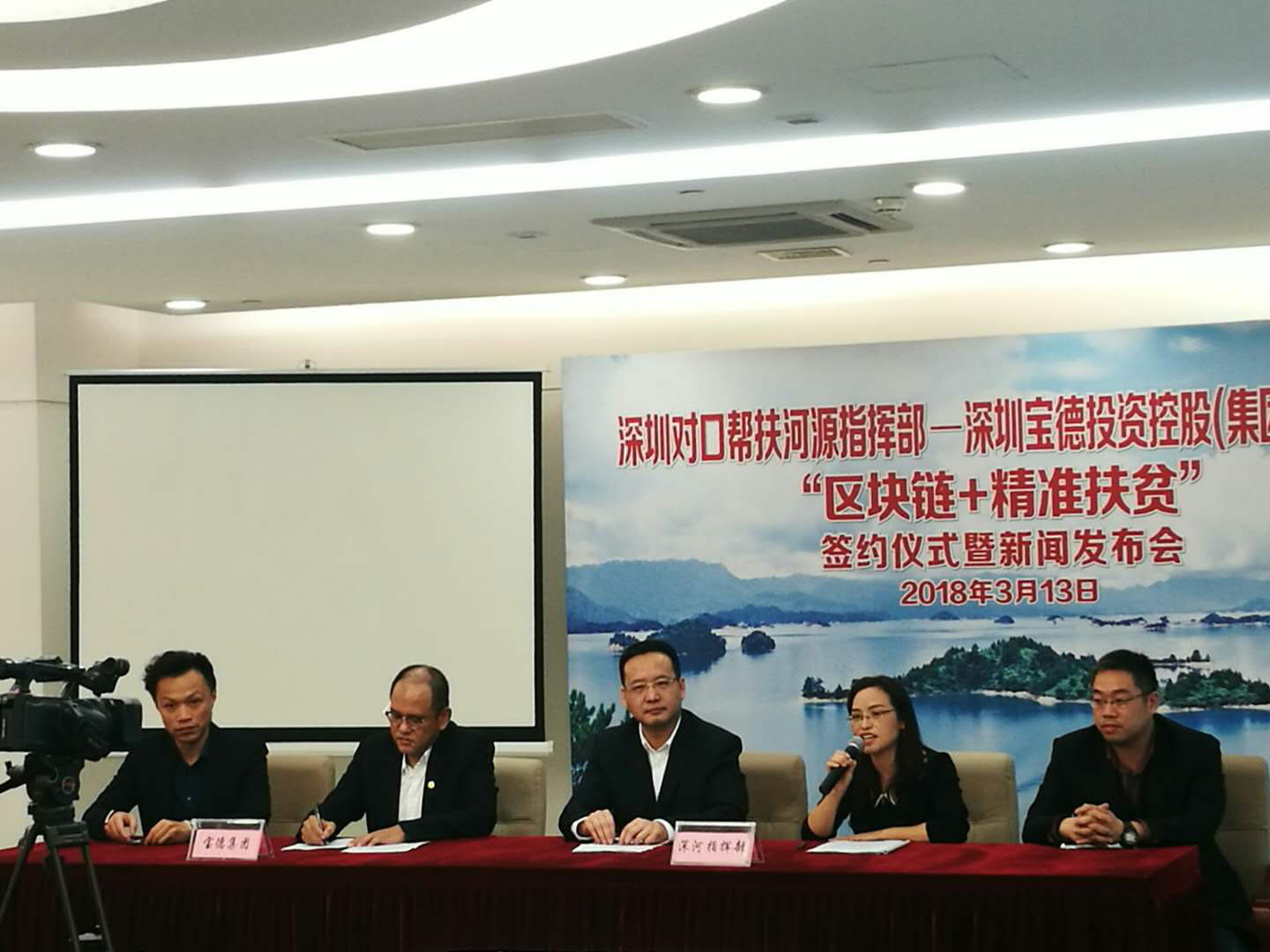 【香港商报网讯】记者 余丽龄 通讯员 薛明地 报道:3月13日,深圳对口帮扶河源指挥部与深圳市宝德投资控股有限公司签订战略合作协议,双方将就“区块链+精准扶贫”项目展开合作,这也是十九大后的首个"区块链+精准扶贫"项目。深圳市政府党组成员陈彪,河源市委常委、副市长、深圳市政府副秘书长、深圳对口帮扶河源指挥部总指挥、河源市高新区党工委书记王卫,河源市政府党组成员叶振云等出席签约仪式。