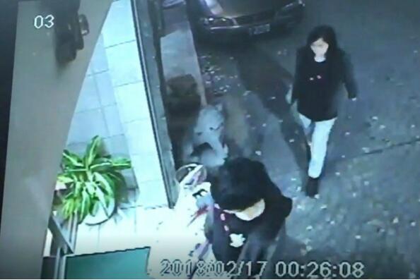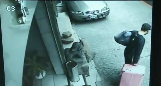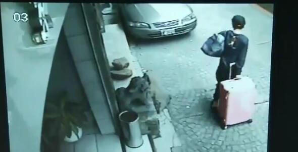 陳拖著一個粉紅色的行李篋進入旅社,潘則跟隨在身後。视频截圖