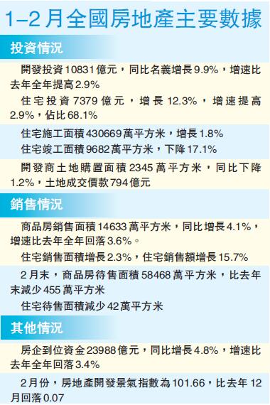 【香港商報网訊】國家統計局昨天公布的數據顯示,1-2月份,房地產開發投資同比上漲9.9%,增速比去年全年提高2.9個百分點,同時銷售面積與銷售額都有所提高。專家認為,近期房地產數據的回暖有明顯的季節性因素,也有政策因素。「因城施策」的進一步細化,客觀上在某些城市的某些區域降低了調控效果,對房地產有些許刺激作用。不過,由於今年的政策方向與調控背景沒有改變,房地產市場整個態勢不會有根本性的變化。香港商報記者 伍敬斌