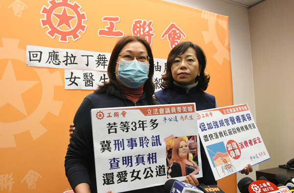 【香港商報网訊】記者馮煒強報道:拉丁舞女導師李嘉瑩在2014年懷疑接受抽脂療程后死亡,警方日前拘捕一名35歲女子,她被控一項誤殺罪,下星期一在九龍城裁判法院提堂。工聯會立法會議員麥美娟昨日陪同死者母親黃女士召開記者會,黃女士在記者會上一度流泪,表示收到有人被捕的通知后非常感觸,希望審訊能盡快完成,還女兒一個公道。