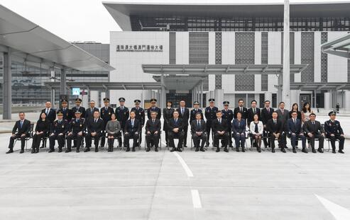 港珠澳大橋澳門口岸管理區開始依照澳門特別行政區法律實施管轄,行政長官崔世安到口岸管理區視察,並與保安司司長黃少澤和運輸工務司司長羅立文、警察總局局長馬耀權和海關關長黃有力等合影。