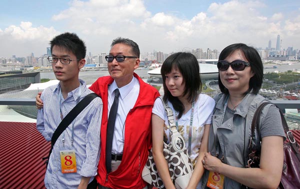 2010年8月27日,李敖在上海世博園區參觀,全家在中國館合影留念。中新社