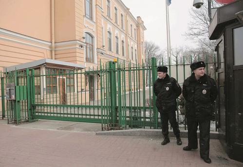 3月17日,在俄罗斯圣彼得堡,警察在英国驻圣彼得堡总领馆外警戒。 新华社发