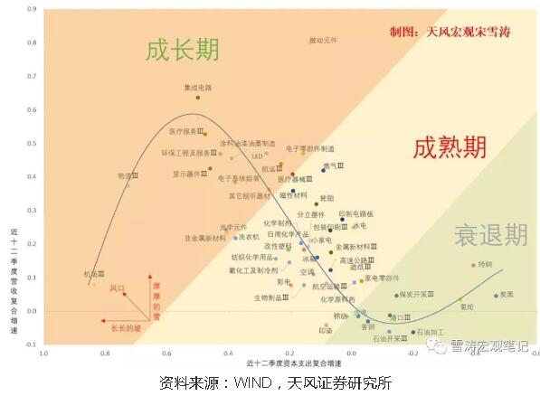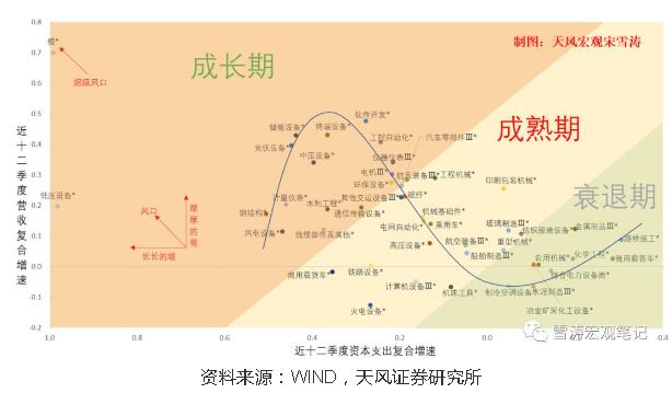我们以过去十二个季度的资本开支复合增速(逆序)为横轴,行业主营业务收入复合增速为纵轴,横轴代表长长的坡(行业成长性),纵轴代表厚厚的雪(收入能力),沿着上坡的方向即是坡长雪厚的行业和代表性公司。尽管每个中国制造细分子行业的生命路径不同,移动速度不同,相对位置不同,但是同一时间将中国制造的所有子行业公平地放置在同一个坐标系里,这些行业绝大多数分布在一条正弦曲线附近,而这条曲线反映的是一个代表性行业的生命周期路径,这说明制造业相互之间还是具有比较强的同质性。