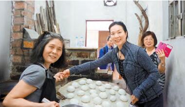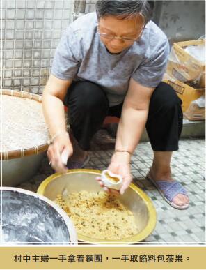 村中主妇同来宾齐来一起包茶果,自得其乐。