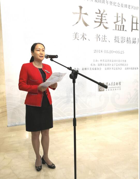 “今天的展览是盐田文艺事业的一个里程碑,标志着我们的艺术水平到达一个新的高度和境界。”在当天举行的开幕式上,盐田区委常委、宣传部部长董秀致辞称,今年恰逢改革开放40周年,也是盐田建区20周年,为此,盐田区文联组织大批艺术家开展专题创作活动。董秀指出,此次展出的220幅精选作品题材丰富,形式多样,展现了盐田优美的自然风光,再现了盐田人民火热的生产生活场景,也表现了盐田人昂扬奋进的精神风貌。