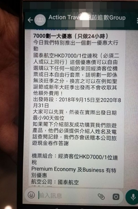 有苦主昨晚在立法會議員劉國勳協助下,前往油麻地警署報警。有女事主表示,預計受害人總數達40人,金額或高達逾100萬元,直言早前還有該公司的WhatsApp短訊促銷,表示可以先訂票,買7000元來回連稅的「期票」,購買後還可以獲現金劵。「期票」可以在今年9月,至下年8月使用等,懷疑是詐騙伎倆,要求當局徹查。