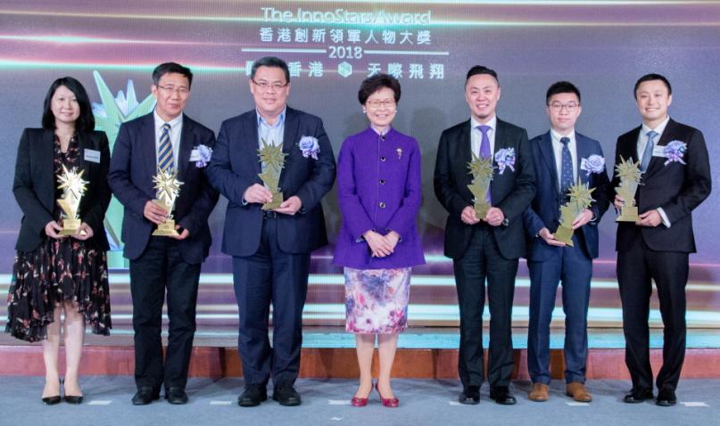 林鄭月娥(中)頒獎予6位得獎創新領軍人,盧煜明代领人赵慧君(左一)、李泽湘(左二)、江庆恩(左三)、李祖闽(右三)、林凯源(右二)及龙沛智(右一)。