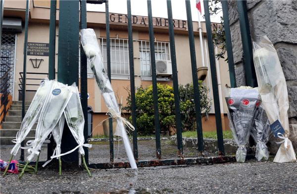 民众在卡尔卡松市的宪兵总部外摆放献花悼念。路透社
