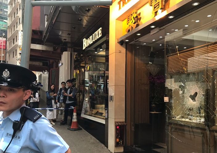 遇劫的珠寶行櫥窗被打爆,穿了兩個大窿,玻璃碎片散滿一地,店外遺下一個黑色背囊,警員又在附近檢獲一頂帽、口罩、一件黑色衫及一對手套,警員分別在和安里及蘭桂坊找到兩個懷疑用來行劫的鐵錘。