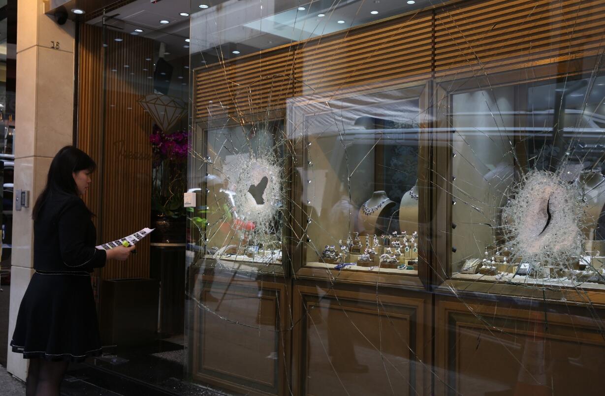 匪徒鐵鎚扑爆珠寶店的櫥窗玻璃。圖:星島
