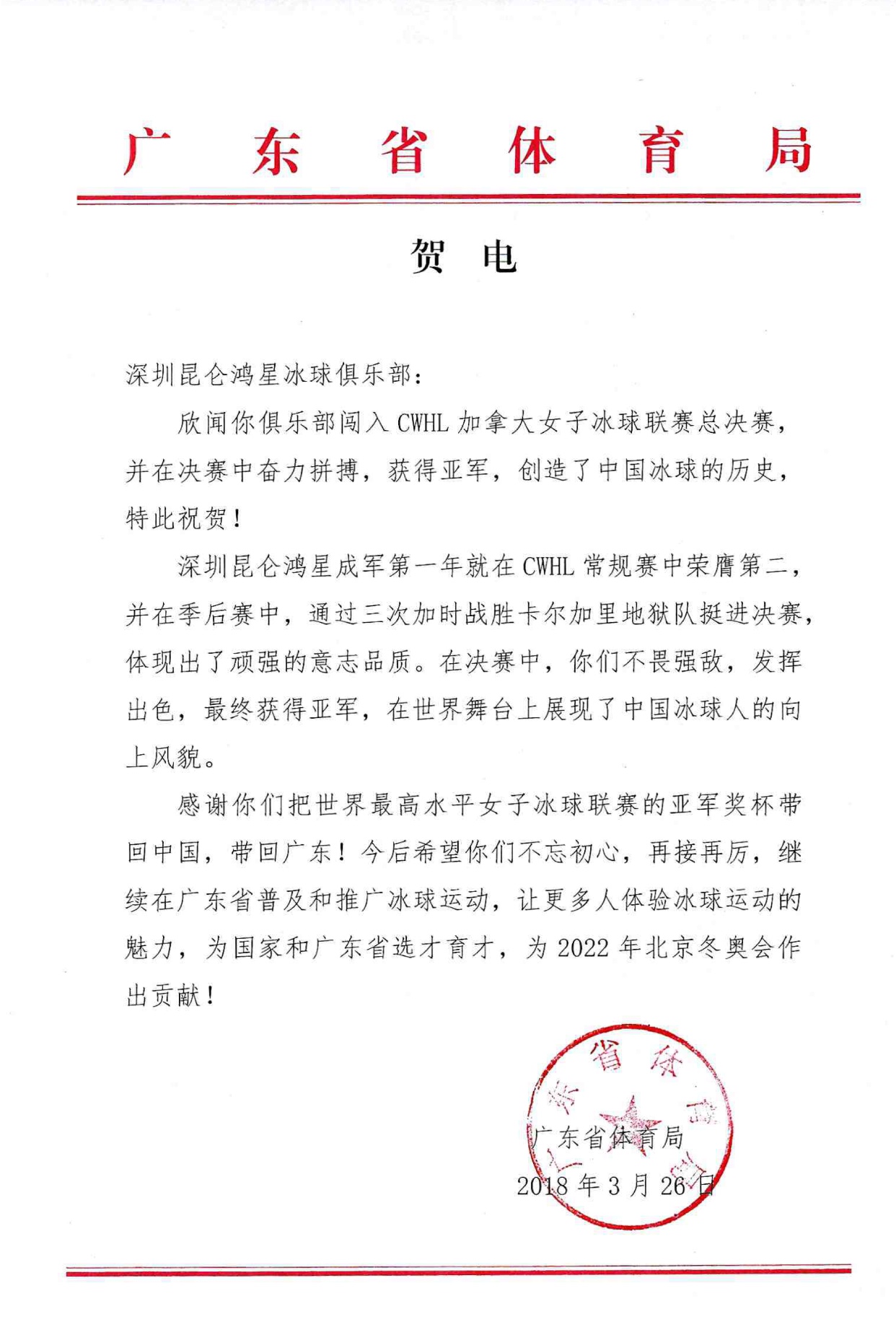 【香港商报网讯】记者卢伟报道: 3月26日零点整,CWHL(加拿大女子冰球职业联赛)克拉克森杯总决赛打响,由深圳昆仑鸿星对战万锦迅雷队。本场比赛,昆仑鸿星第一节先失一球,第二节由史塔克将比分扳平。加时赛中,万锦迅雷队斯塔西打入绝杀球,最终昆仑鸿星以1-2加时憾负万锦迅雷队,但获得亚军仍然是中国冰球在世界顶级冰球职业联赛中取得的最好成绩。赛后,广东省体育局发来贺电,对深圳昆仑鸿星夺得CWHL亚军表示祝贺。