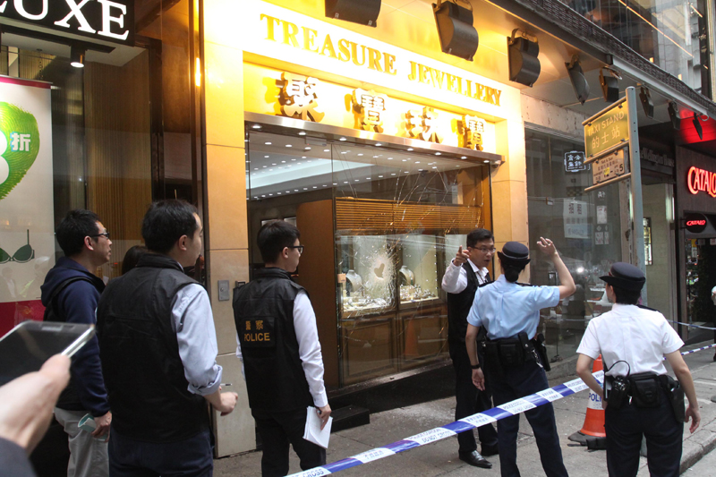 案發現場為威靈頓街16號地下「聚寶珠寶」珠寶店,昨晨11時許,職員準備開門營業時,3名戴鴨舌帽和口罩的匪徒突然走到大門前,其中2人手持大鐵鎚,不由分說猛擊櫥窗玻璃,當場擊破2個大洞,匪徒隨即從櫥窗拿出珠寶鑽飾放入一個背囊,得手後3人沿威靈頓街轉入懷德里再跑至蘭桂坊逃去。