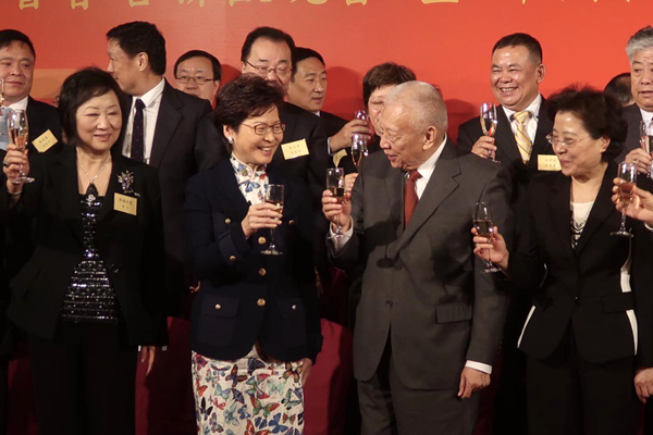 董建華和林鄭昨晚同場現身香港舟山同鄉會春茗聯歡晚會,一起舉杯言談甚歡。記者余江強攝