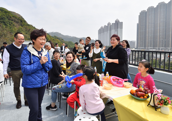 今年春節過后,林鄭到訪深井,與數十名「光屋」住客一起吃開年飯。資料圖片