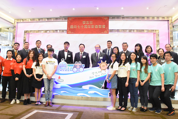 中聯辦副主任譚鐵牛(后排左六)、政務司司長張建宗(后排右八),昨出席學友社邁向70周年新春聚餐。記者馮瀚文攝