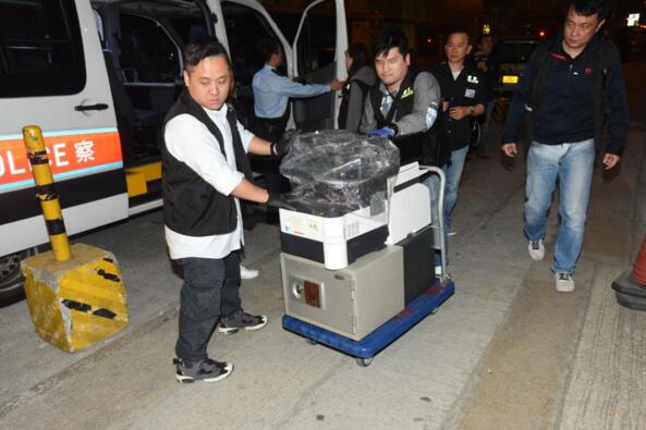 警方於單位檢獲大批文件、一部點鈔機、七部電腦、兩個夾萬。圖:星島
