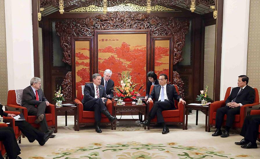 3月27日,国务院总理李克强在北京中南海紫光阁会见美国联邦参议员戴恩斯率领的议员访华团。 新华社记者 刘卫兵 摄