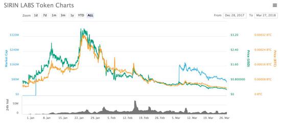 从预订流程来看,想要买到这款手机必须使用 Sirin Labs 的虚拟货币 SRN 来支付。而根据 Coinmarketcap 的数据,SRN 币价已经从今年 1 月的历史高位跌掉 70%。交易量已经从最高时每天7600万美元跌到近日的1100万美元,距离破发仅差20%。