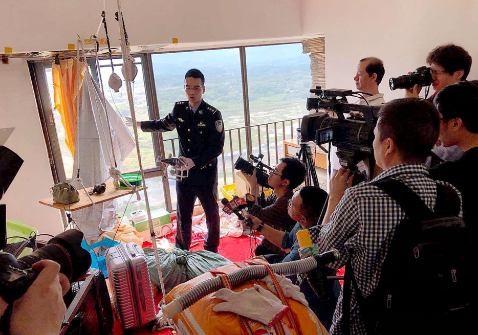 深圳執法人員在走私分子單位內手持涉案無人機介紹破案過程。