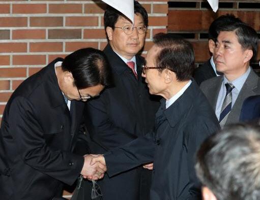 李明博被移送至拘留所前,与亲信道别。