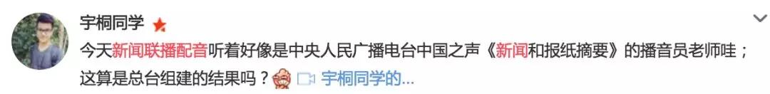 來自中央人民廣播電台《新聞和報紙摘要》的播音員忠誠、方亮、鄭嵐 等幾位著名播音員首次獻聲《新聞聯播》,這不僅是“廣播人”第一次為《新聞聯播》配音,也是央視和央廣在中央廣播電視總台成立後首次開啟的融合之舉。