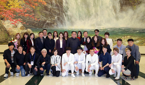 演出結束後,金正恩與韓國藝術團成員合影。 路透社