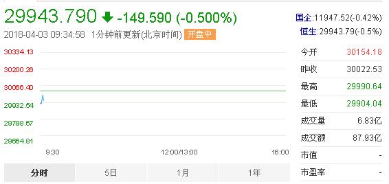 隔夜美股三大股指大幅下挫,道指跌幅达1.9%。恒指今早低开0.55%,报29927点,失守30000点大关;国企指数低开0.49%,报11940点;红筹指数低开0.71%,报4377点。