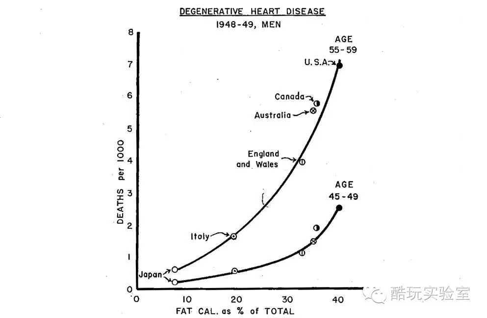 1956年,凱斯進行了一場噱頭極大的研究,這就是著名的“七國實驗”,他根據實驗結果得出了“心髒病的元凶是脂肪而不是糖”這樣的結論。事實上,他篩選了自己的研究數據,實驗一共對22個國家的民眾進行了采樣,但發表結論時論文中只用了7個國家的數據,不但故意排除了瑞士和法國這樣普遍膳食脂肪含量很高的健康國家,還從12770人中單挑出500個左右對他有利的數據進行分析。