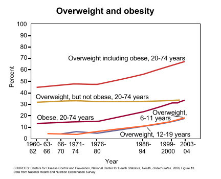 |美國1960年至2004年的肥胖率曲線圖,overweight代表超重,obese代表過度肥胖——圖片來自維基百科