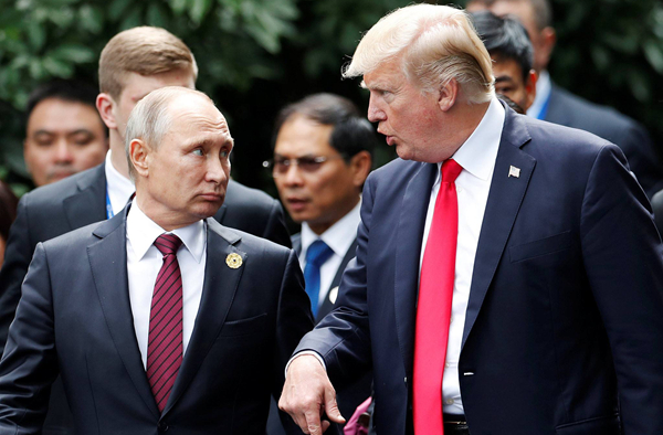 白宮方面表示,特朗普早前與普京總統通話時,提議在華盛頓舉行兩國元首會晤,白宮是備選場地之一。圖為去年二人在APEC峰會上邊走邊聊。 網絡圖片