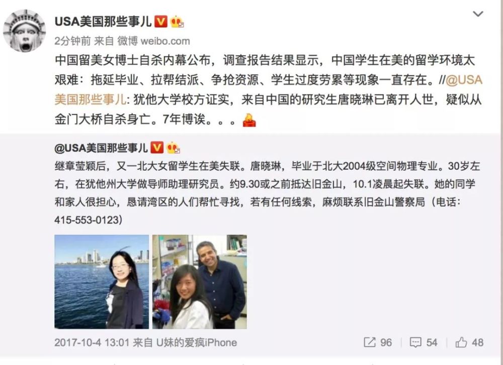 直到今天,除了楊寶德和陶崇園,中國留美女博士唐小琳自殺的新聞緊跟著傳來,也直指研究生階段學生面臨的問題。