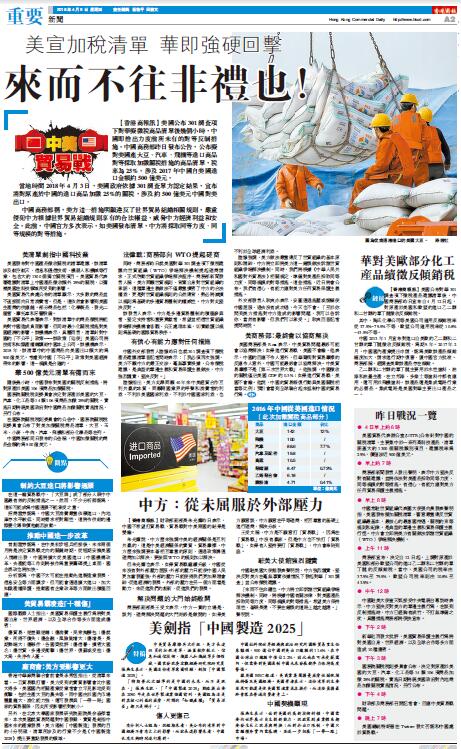 【香港商報网訊】美國公布301調查項下對華擬徵稅商品清單后幾個小時,中國即推出力度前所未有的對等反制措施。中國商務部昨日發布公告,公布擬對美國產大豆、汽車、飛機等進口商品對等采取加徵關稅措施的商品清單,稅率為25%,涉及2017年中國自美國進口金額約500億美元。