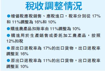 《通知》規定,自5月1日起,納稅人發生增值稅應稅銷售行為或者進口貨物,原適用17%和11%稅率的,稅率分別調整為16%、10%。納稅人購進農產品,原適用11%扣除率的,扣除率調整為10%。納稅人購進用於生產銷售或委託加工16%稅率貨物的農產品,按照12%的扣除率計算進項稅額。