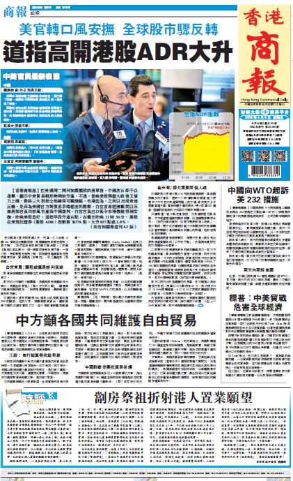 【香港商報网訊】在美國周二開列加徵關稅的清單后,中國次日即予以還擊,顯示中美貿易戰形勢開始升溫。不過,當晚美股開盤大跌后又發力上漲,最終三大股指全部錄得可觀漲幅。市場認為,之所以出現奇迹反轉,是因為美國官方對貿易爭端態度的松動,白宮首席經濟顧問以及商務部官員均放風有意與中國談判。白宮官員出口術令市場情緒得到安撫,昨晚美股造好,道指早段升逾百點;而截至昨晚11時30分,港股在美預託證券(港股ADR)指數報30376點,大升857點或2.8%。
