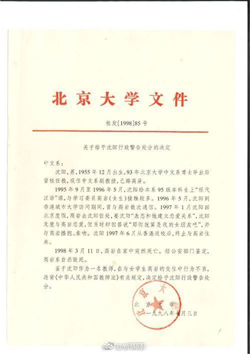 今天中午,北京大学发布通报,公开了1998年校方、中文系的两份处分决定。《处分决定》的措辞是:1997年1月沈阳回北京度假,高岩去沈阳住处,要沈阳“表态和她建立恋爱关系”,沈阳无意与高岩恋爱,但当时却回答说“那你就算是我的女朋友吧”,并与高岩搂抱、亲吻。