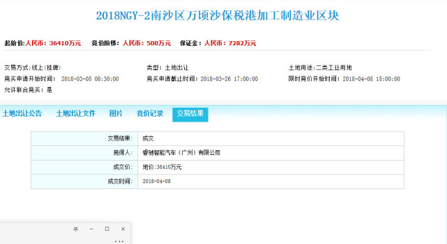 4月8日,腾讯《一线》自广州市公共资源交易中心确认,睿驰智能汽车(广州)有限公司(下称“睿驰汽车”)以底价3.641亿元,正式拍得广州市南沙区一块约601亩的制造业用地。睿驰汽车系贾跃亭FaradayFuture(法拉第未来)的关联公司。