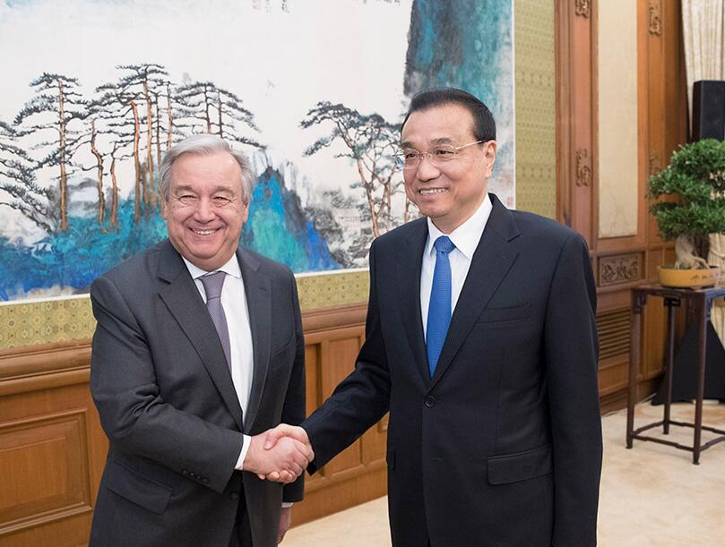 李克强积极评价中国同联合国的关系与合作,强调中国坚定维护以联合国宪章为基础的国际关系基本准则,支持联合国在国际事务中发挥核心作用,将继续建设性参与联合国各领域工作,积极推动落实联合国2030年可持续发展议程,为促进世界和平与发展作出不懈努力。