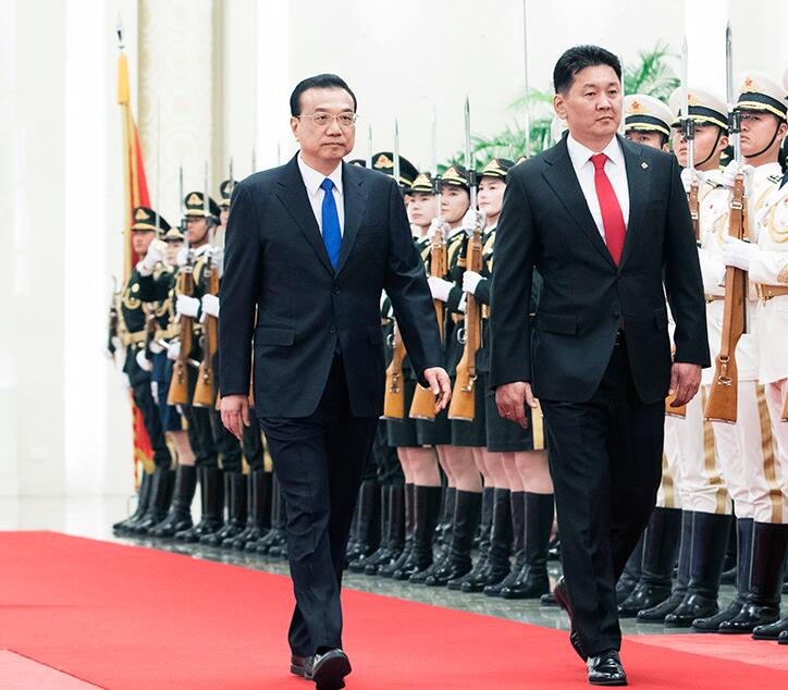 会谈前,李克强在人民大会堂北大厅为呼日勒苏赫举行欢迎仪式。
