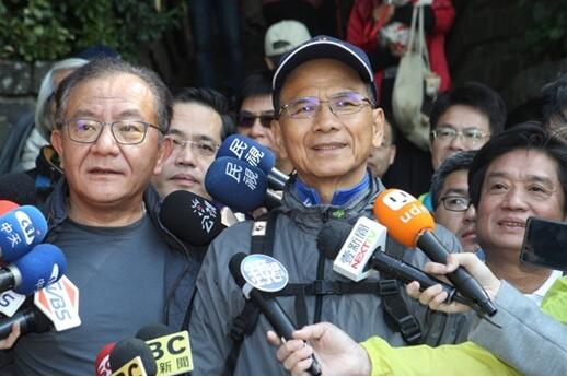 8日,台湾行政机构前负责人游锡堃(右)偕同民进党“立委”高志鹏(左)前往观音山健走,高志鹏就新北市长选举向蔡英文撂话。(台媒)